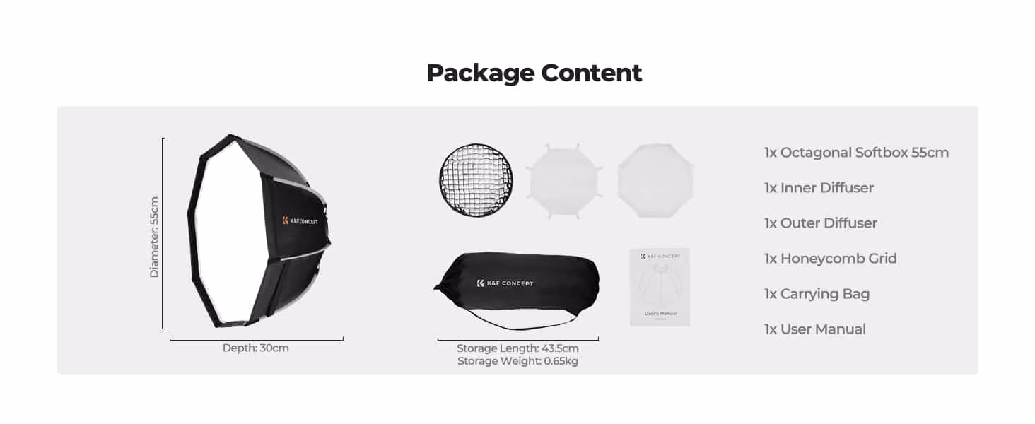 To further enhance its portability and longevity, the K&F Concept 55cm Octagonal Softbox comes complete with a dedicated carrying bag. This custom-sized, durable bag is more than just a storage solution; it’s an essential accessory designed to protect your softbox and its components during transit. It keeps the inner and outer diffusers, honeycomb grid, and user manual neatly organised and secure, preventing damage, loss, or wear and tear. For freelancers and professionals who traverse various locations, this robust carrying bag ensures that your valuable lighting gear remains pristine and ready for action, allowing you to focus on your creative work without worrying about equipment protection.