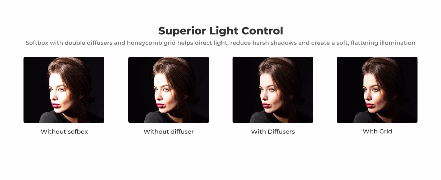 • 16-Sided Parabolic Hexadecagon Design, creates soft, even light with natural-looking, round catchlights.