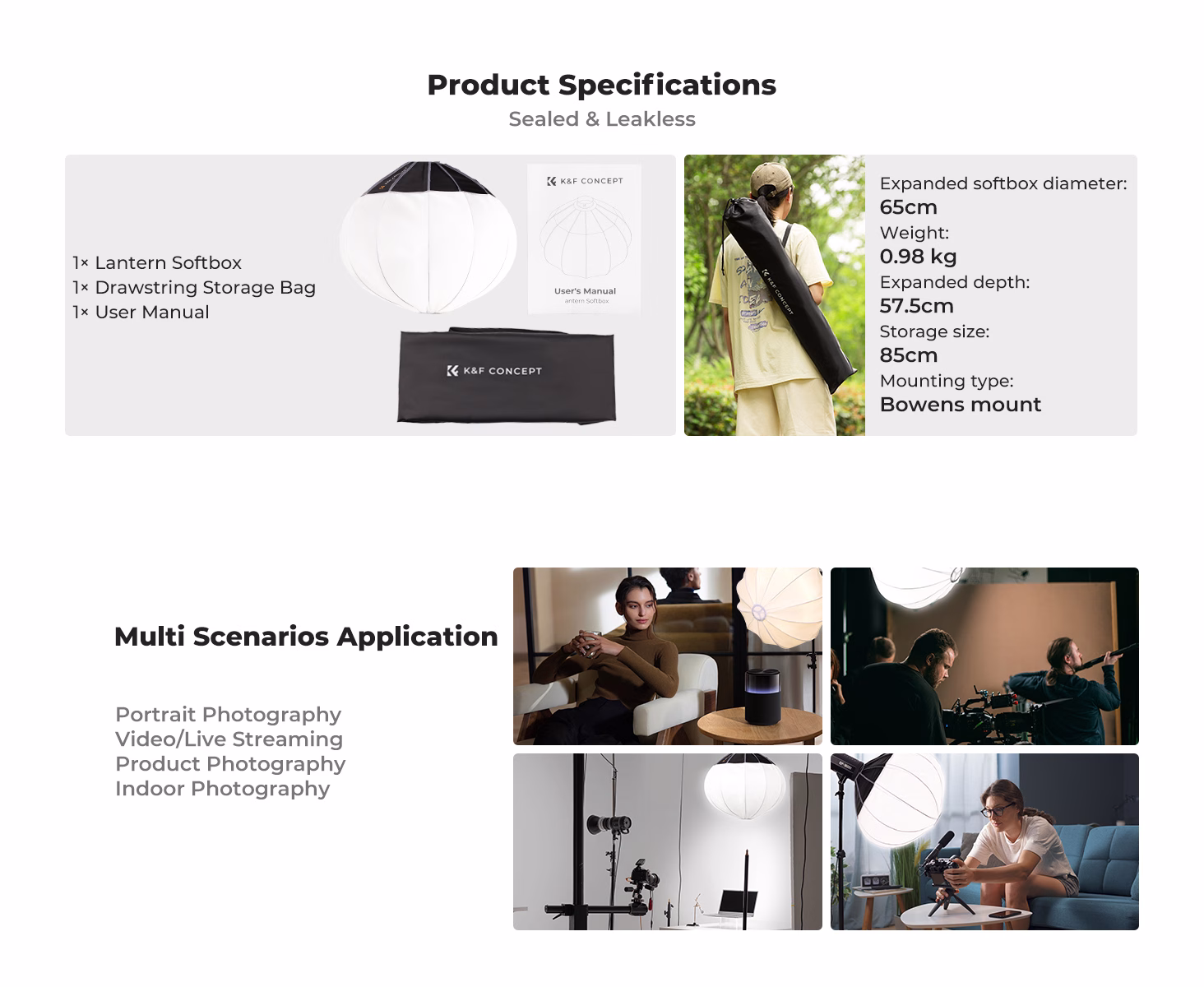 Compatibility: The K&F 65cm Lantern Softbox (model KF18.0009) is compatible with any lighting device featuring a Bowens Mount. This includes COB lights, studio strobe lights, and continuous LED video lights that utilize a Bowens mount. It is ideal for group portraits, indoor photography, product photography, and video shooting requiring soft, omnidirectional light.