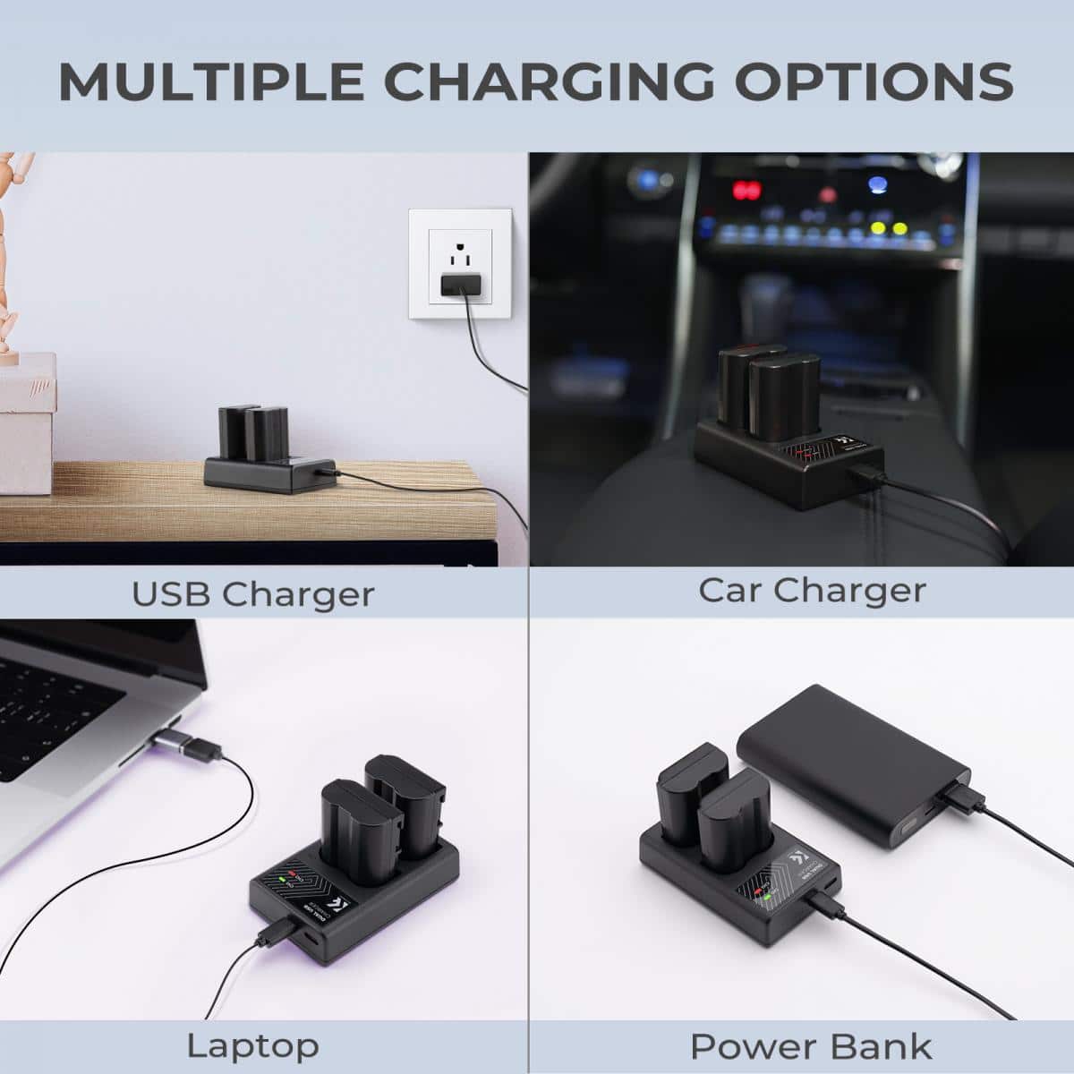 Enjoy the convenience of multiple power source options. The charger can be connected to any device with USB output, such as a power bank, laptop, PC, car USB adapter, power socket, and more. This versatility ensures that you can charge your batteries wherever you go, while on the go, providing uninterrupted power for your photography sessions.